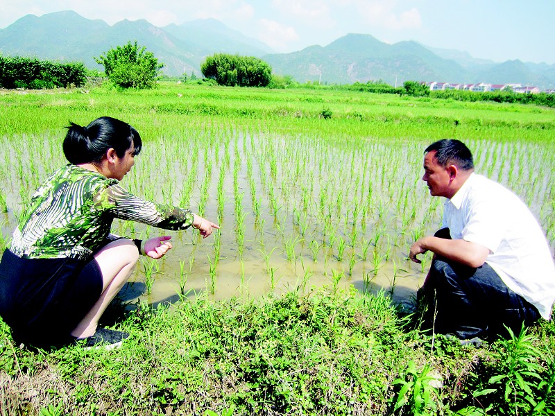 5月19日,临海市白水洋镇种粮大户朱崇敏和妻子在王山头早稻基地,检查早稻生长情况。今年他们种下的400亩早稻长势喜人,接下来计划再种晚稻1000亩,预计今年能产稻谷800多吨。 杨叶灿 摄