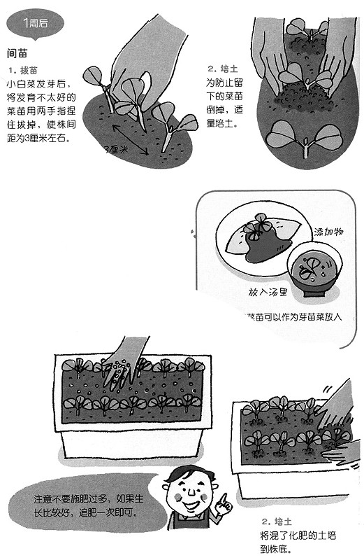 小白菜发芽后,将发育不太好的菜苗用两手指捏住拔掉,使株间距为3厘米左右。