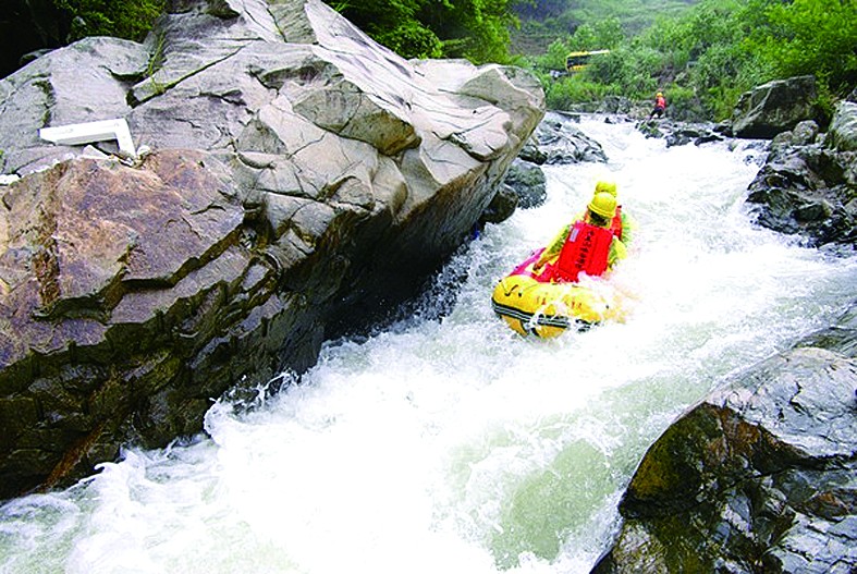 浮盖山峡谷漂流,分为激情漂与逍遥漂两种漂流方式。逍遥漂长约3.5公里,河滩开阔,游鱼可数、青山对峙、风景迷人。顺溪而下,如同冲浪,有惊无险,享受神仙般的逍遥。而激情漂长约2公里,水流湍急,落差起伏,奇石怪石,遍布河滩,艇穿激流,跌宕起伏,精险刺激。