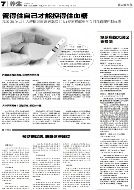 个“联合国糖尿病日”,今年的主题是“着眼糖尿病”。2013年中华医学会糖尿病学分会公布糖尿病流行病学调查结果显示,我国 30岁以上人群糖尿病患病率达11.6%,估计全国有1.39亿糖尿病患者,已成为世界第一糖尿病大国。专家表示,要着眼糖尿