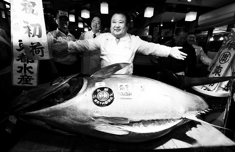 近日,日本东京筑地水产市场迎来了2017年的首个交易日,开市时最大的一条蓝鳍金枪鱼被寿司连锁店“寿司三昧”拍得,这条重212公斤的金枪鱼成交价高达7400万日元(约4370000人民币)。 (据人民网 2017年1月10日)