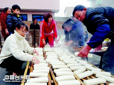 近日,在玉环县龙溪镇梅岙村,村民正在加工年糕。年糕寓意幸福生活年年高,做年糕是玉环农村喜庆新春的一种风俗习惯。 吴达夫 摄