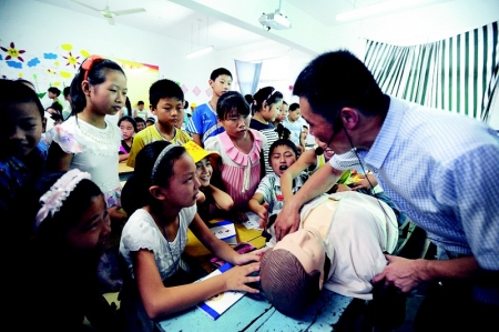 “十二五”以来,全省各级红十字会深入开展应急救护培训进农村、进学校、进社区、进机关、进企事业单位等“五进”活动,受到社会各界欢迎。图为救护培训师在台州志远学校为同学们开展救护知识普及培训。