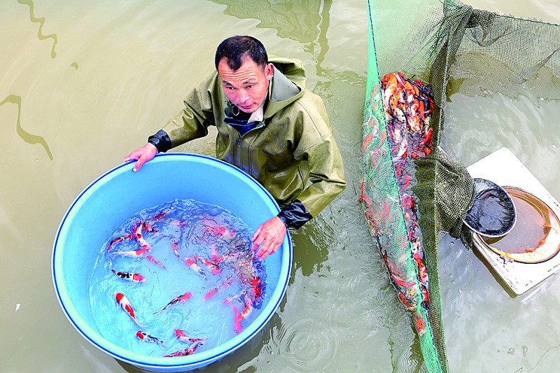 林长豪抓着一尾观赏鱼介绍说:“像这一尾,身上红白黑三色相间,色泽匀称清秀,目前可以卖两三百元,如果养到明年这个时候,达到四五十厘米长时,可以卖到上千元!”“不同的花纹有不同的寓意,像这一尾红白相间,色泽艳丽,寓意喜庆;这尾通体墨黑,名叫‘龙凤黑鲤’,有辟邪挡煞的寓意;像这尾通体金黄,没有一丝杂色,名叫‘黄金’,寓意发财……”说到观赏鱼的品质优劣,林长豪如数家珍,“我从1997年开始养殖观赏鱼,至今已有20个年头了。”