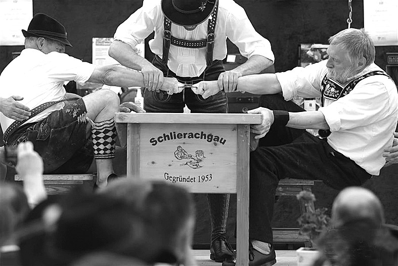 5月25日,在德国的韦尔恩斯米尔,第40届阿尔派恩手指角力比赛现场,选手们用中指勾住环形皮套,先将对方上身拉过桌面界限者获胜。
