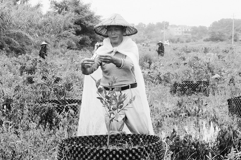 6月26日,衢州市衢江区蜜之源家庭农场员工正在冲洗橘苗叶片上的泥渍,摘除死叶、枯叶,以保障橘苗健康生长。 本报记者 蔡希师 摄