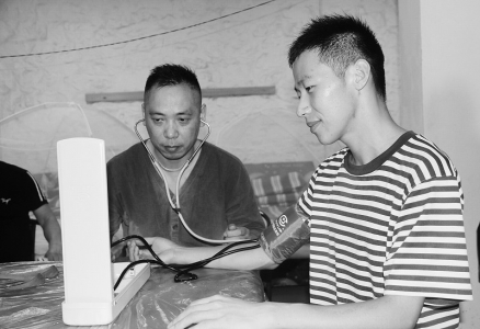建军节到来之际,温岭市松门镇个体私营者协会组织部分党员志愿者翻山越岭,来到某部驻地慰问官兵。图为党员志愿者为官兵做健康检查。 江文辉 摄
