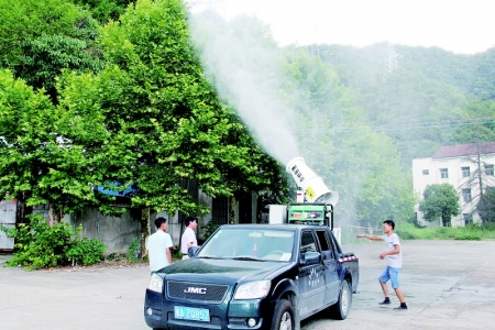 近日,在桐庐县农业科技培训学校的操场上,该县引进的首台车载风送式喷雾器正在进行植保作业。 方玉亭 摄