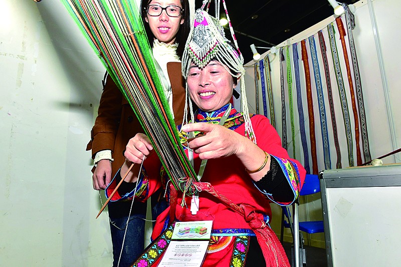 在森博会的“畲祖烧”体验区,非遗传承人现场展示手工织布。