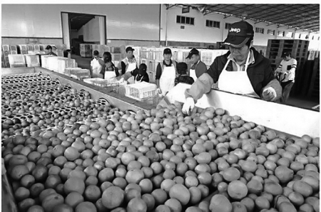 日前,宁波海静食品有限公司员工将一筐筐柑橘倒在筛选机上筛选。时下正是柑橘丰收季节,连日来,海静食品、卡依之食品等企业开足马力进行柑橘加工,累计每天加工200吨左右。目前,每公斤柑橘收购价在2元左右,比去年略有上升。 宁海新 摄