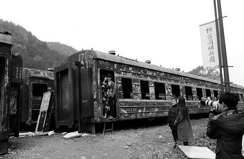 12月5日,一对情侣在东阳横店镇中兴联村尚伦庄正在装修施工的绿皮火车车厢旁拍摄写真。“这8节退役的绿皮火车车厢将通过改造装修变成特色民宿,为横店尚伦庄美丽乡村产业点睛。”当日,建设方负责人赵女士介绍,这些绿皮火车车厢格外引人注目,每天都有许多游客、影楼前来取景拍照。