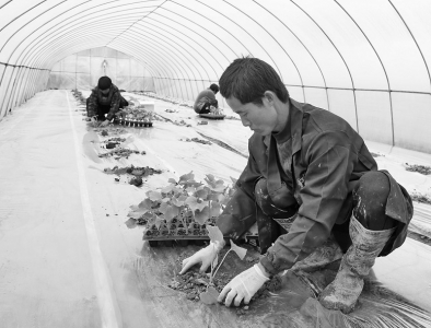 春节过后,玉环农户纷纷行动起来备春耕。图为玉环市干江镇花明村瓜农鲍学方和小工一起栽种冬瓜苗,把新年的丰收希望寄托在新一轮农作物上。 吴达夫 摄