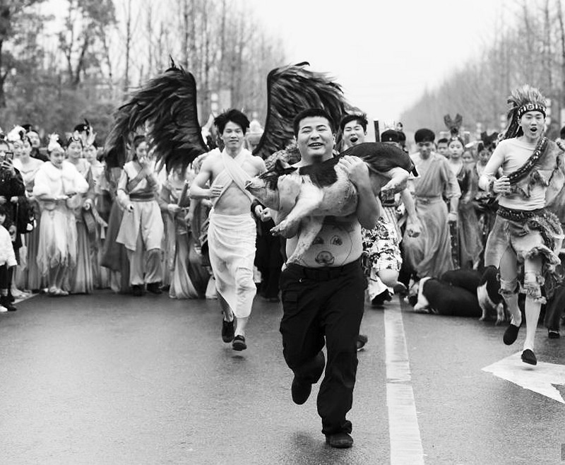 近日,湖南宁乡炭河古城举行千人“光猪跑”,在7头花猪的带领下,参赛者需身着古装或赤膊奔跑5公里,冠军将获得一头宁乡花猪作为奖励。 (据中国新闻网 2018年3月25日)