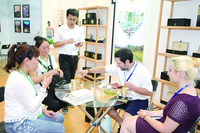 来自美国的茶商(右二)经常采购龙井茶,在茶博会龙坞展区,他忍不住向前来咨询的国内茶商推荐起了杭州龙坞产的龙井茶。 本报记者 叶敏 摄