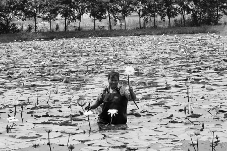 在艺溯家农场的水塘里,当地工人正在采摘香水莲花(见图)。只见他们熟练地在水底摸索,不一会就剪出一枝带茎的花来。“以前养鱼时没这么讲究,现在感觉自己就像园丁一样了。”在现场,工人李文英说。