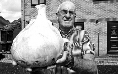 英国南约克郡唐卡斯特74岁的退休锅炉工戴维·斯托瑟近日收获了一颗巨型洋葱。这颗洋葱重达4.54公斤,围径达60厘米。事实上,这不是斯托瑟第一次成功种植巨型蔬菜。2017年,他曾收获了一堆巨大的胡萝卜。