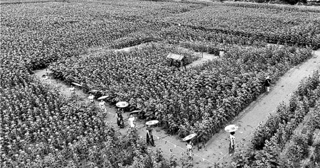 8月,向日葵进入盛放期。甘肃张掖的村民以向日葵为主题,结合农耕文化打造了向日葵迷宫,吸引众多游客前来赏花和体验挑战迷宫的乐趣。图为游客在向日葵花海迷宫内游玩。
