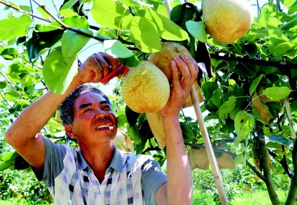 9月5日上午,台州绿欣果蔬合作社梨园内,管理员王如田正在采摘最后一批成熟的蒲瓜梨,准备以每公斤20-30元的价格卖给游客。据了解,该合作社采取“基地+合作社+自由采摘+网络销售”的方式,取得较好的经济效益。