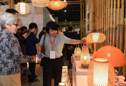 客商在采购洽谈竹制灯罩等工艺品。 龚献明 摄
