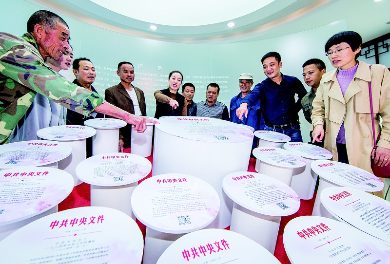 改革开放以来,党中央下发了20份聚焦“三农”的“一号文件”,给农民吃下了定心丸。图为德清县阜溪街道五四村村民在历年中央一号文件展板前学习、回顾。