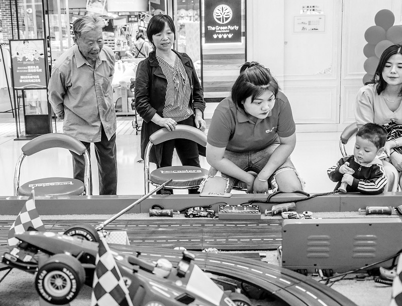 昨日,衢江区杜泽镇的金女士陪着87岁的父亲(左一),来到衢州市区游览。在一家大型购物中心,老父亲居然被儿童赛车所吸引。金女士耐心地陪着父亲,给他讲述城里的新鲜事,提前给父亲过一个新鲜的父亲节。 胡江丰 摄
