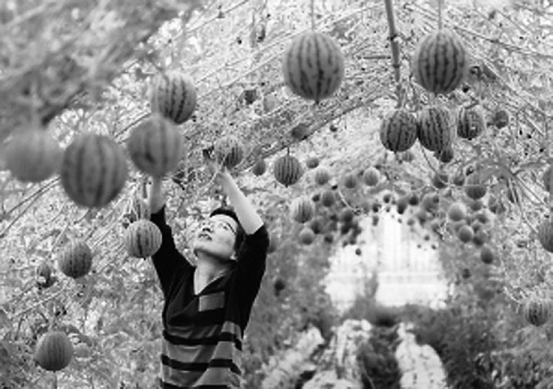 7月2日,德清县新田农庄工作人员在查看空中西瓜长势。