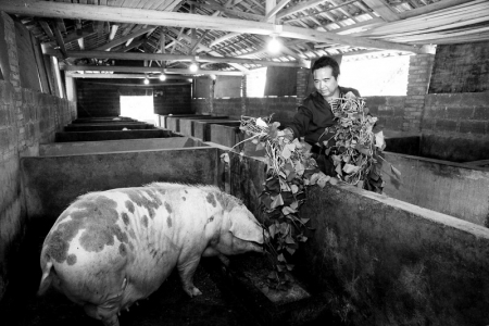 日前,在开化县华埠镇金星村王子农场的生态养殖场,养殖户王金华正在用番薯藤喂猪。