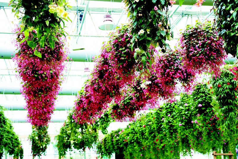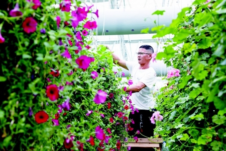 安吉县递铺街道田园鲁家农业高科技示范园生产的垂吊花卉,畅销市场。图为该园“百花馆”技术人员正在培护立体垂吊花卉。 方琪 摄