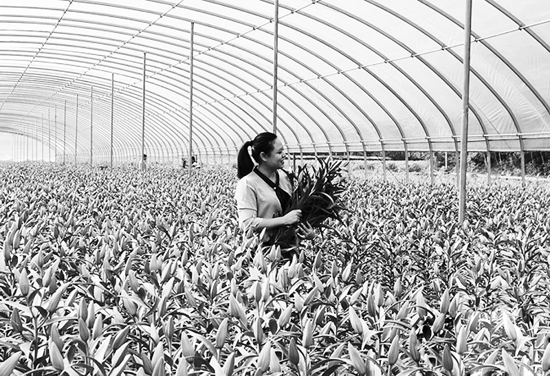 十月以来,在庆元县荷地镇黄沙村高山百合花种植基地里,4万多株百合花含苞待放,工人们忙着采收打包发往广东市场,每株价格12元。 谢力 吴梦燕 摄