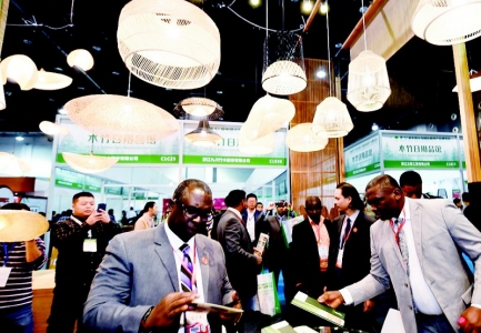 中外客商在森博会上参观时尚前卫的竹艺灯饰。 龚献明 摄