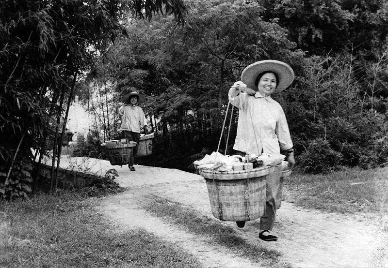 图⑨:新中国成立后,供销社用背篓打通供销、用扁担连接城乡,成为城乡物资交流、农村商品流通的主渠道。图为供销社职工用扁担送物资下乡。