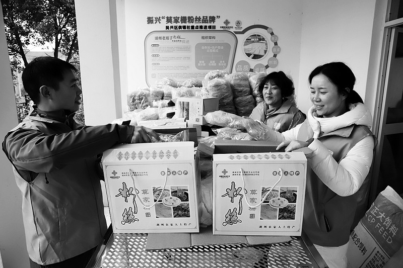 湖州吴兴区埭溪镇莫家栅是传统的“粉丝村”,去年有关部门在该村建立粉丝绿色发展基地,成立专业合作社,配置标准化生产车间,统一生产标准和品牌,扶持农户致富。图为日前合作社社员们正在包装发货。 邓德华 摄